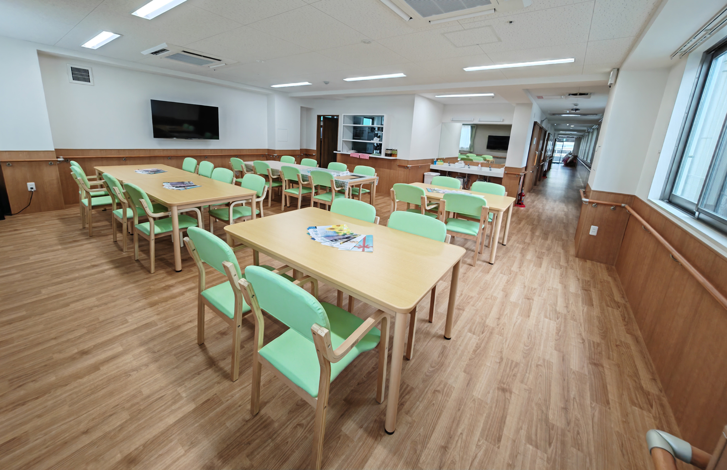 快適に安心して暮らしていただけるよう居室にはバリアフリー設計を施し、共有スペースにはくつろぎの場や談話スペースを設置。